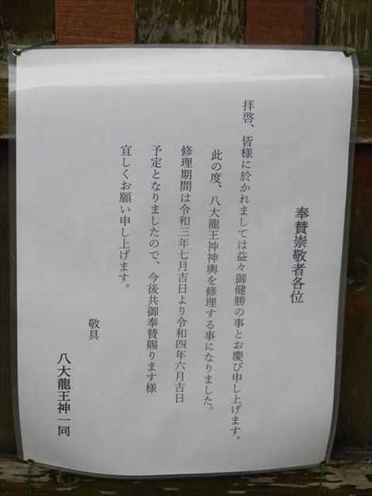 修理期間は令和三年七月吉日より令和四年六月吉日予定となりましたので、今後共