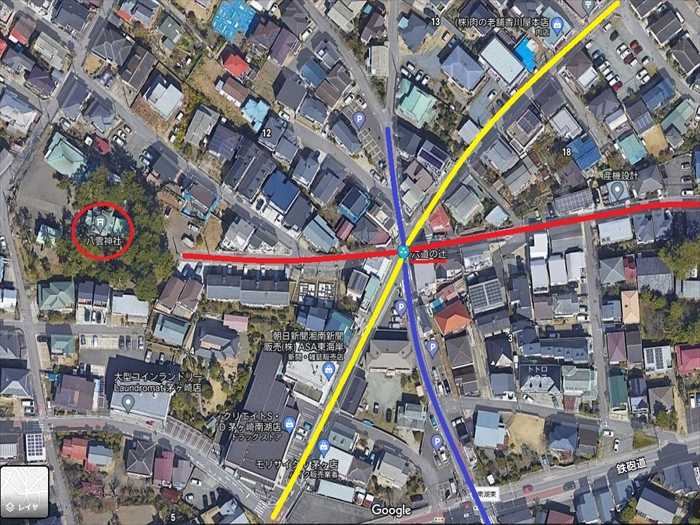 もともとこの辻は、「八雲神社」から東へ延びる「旧鉄砲道」 (赤線) と、南湖の船着場から