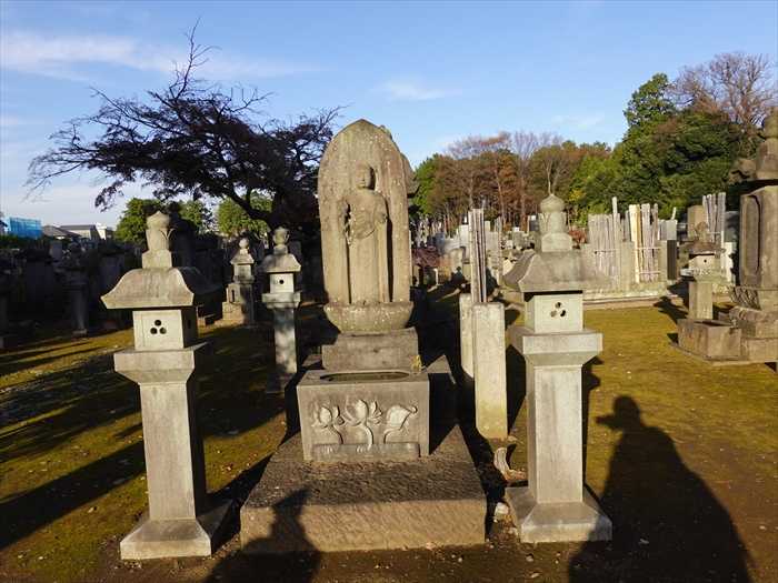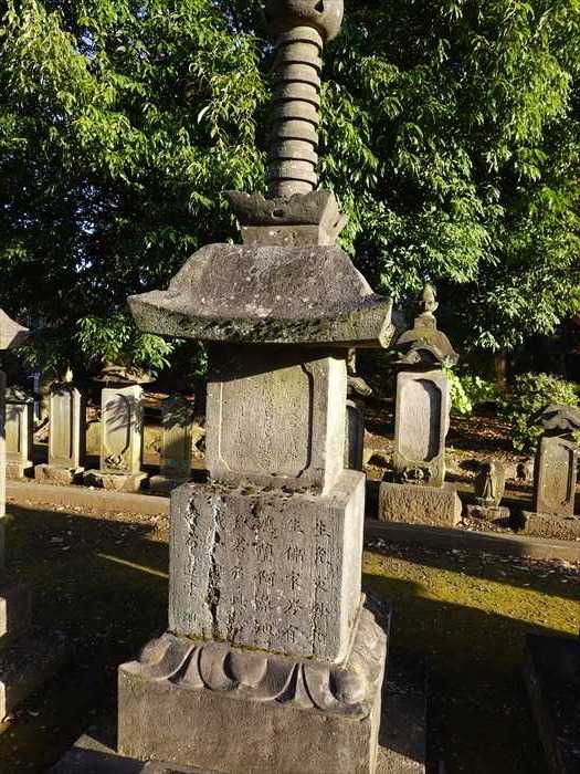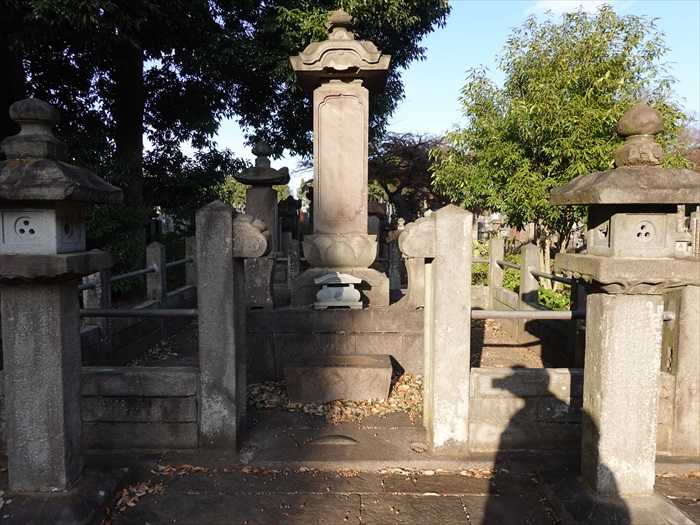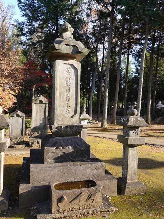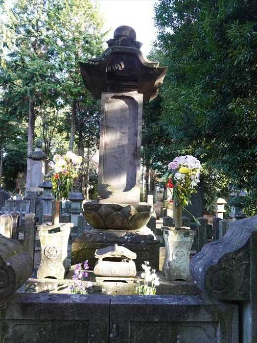 左に「青松院殿榮覺祖春大姉」と刻まれた墓。