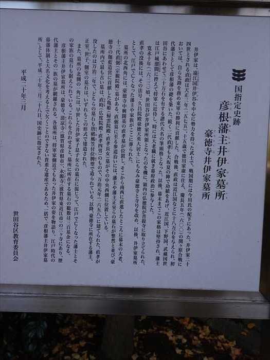 「国指定史跡 彦根藩主井伊家墓所 豪徳寺井伊家墓所」案内板。