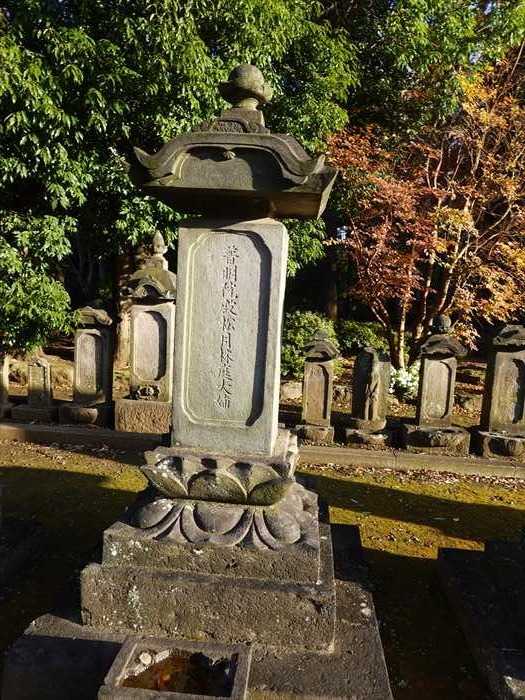 「普明院殿松月林庭大姉」と刻まれた墓石。