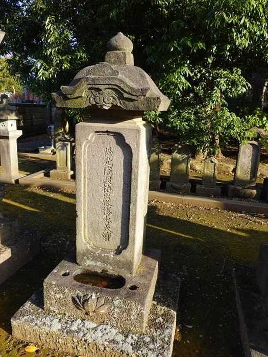 「陽光院殿梅巖淳香大姉」と刻まれた墓石。