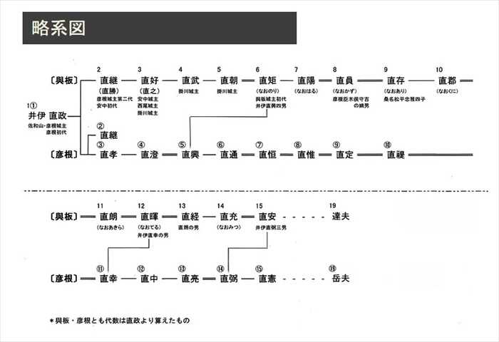 下図の代数は1代ズレているが、以下の表記は「豪徳寺 井伊家墓所全体図」に従う。
