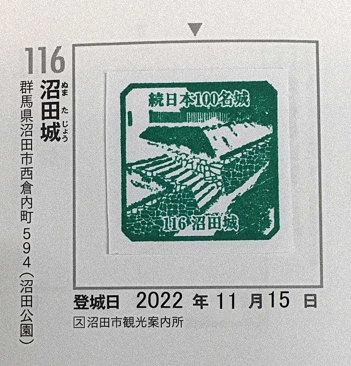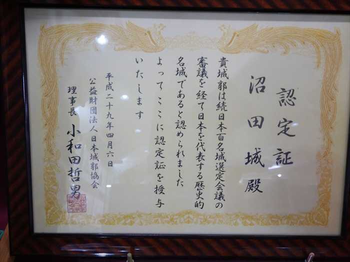「続日本百名城」の「沼田城」の「認定証」。
