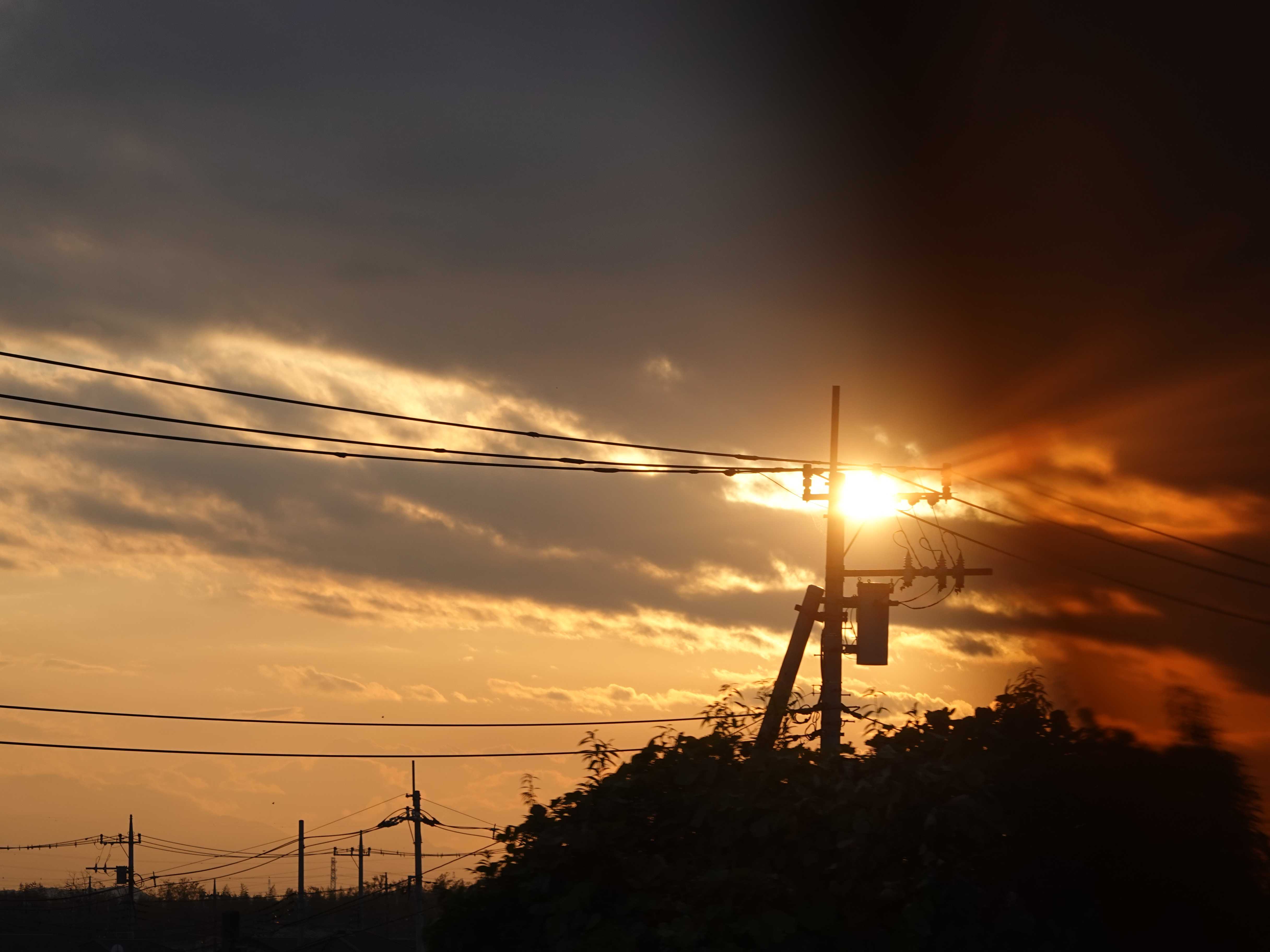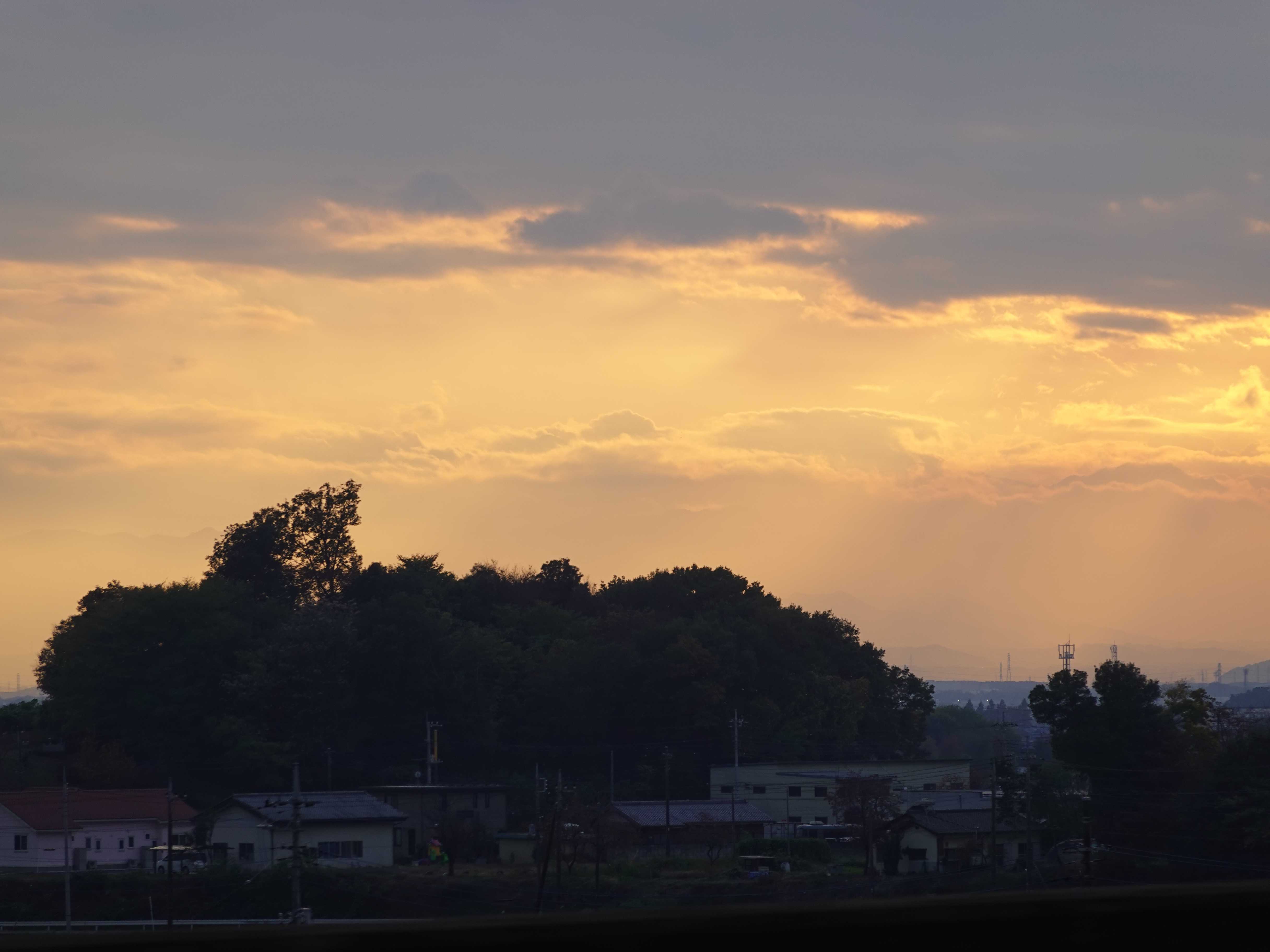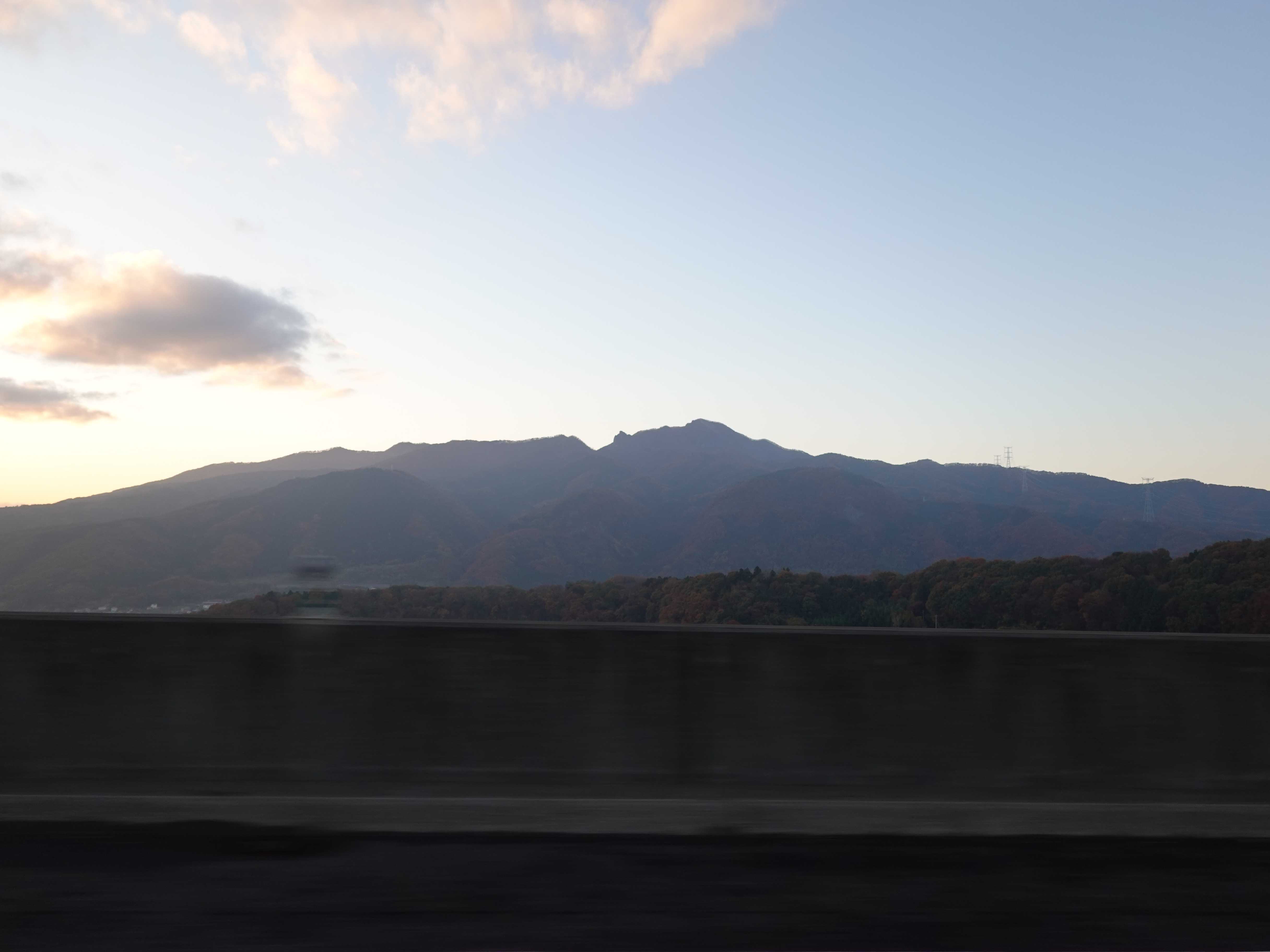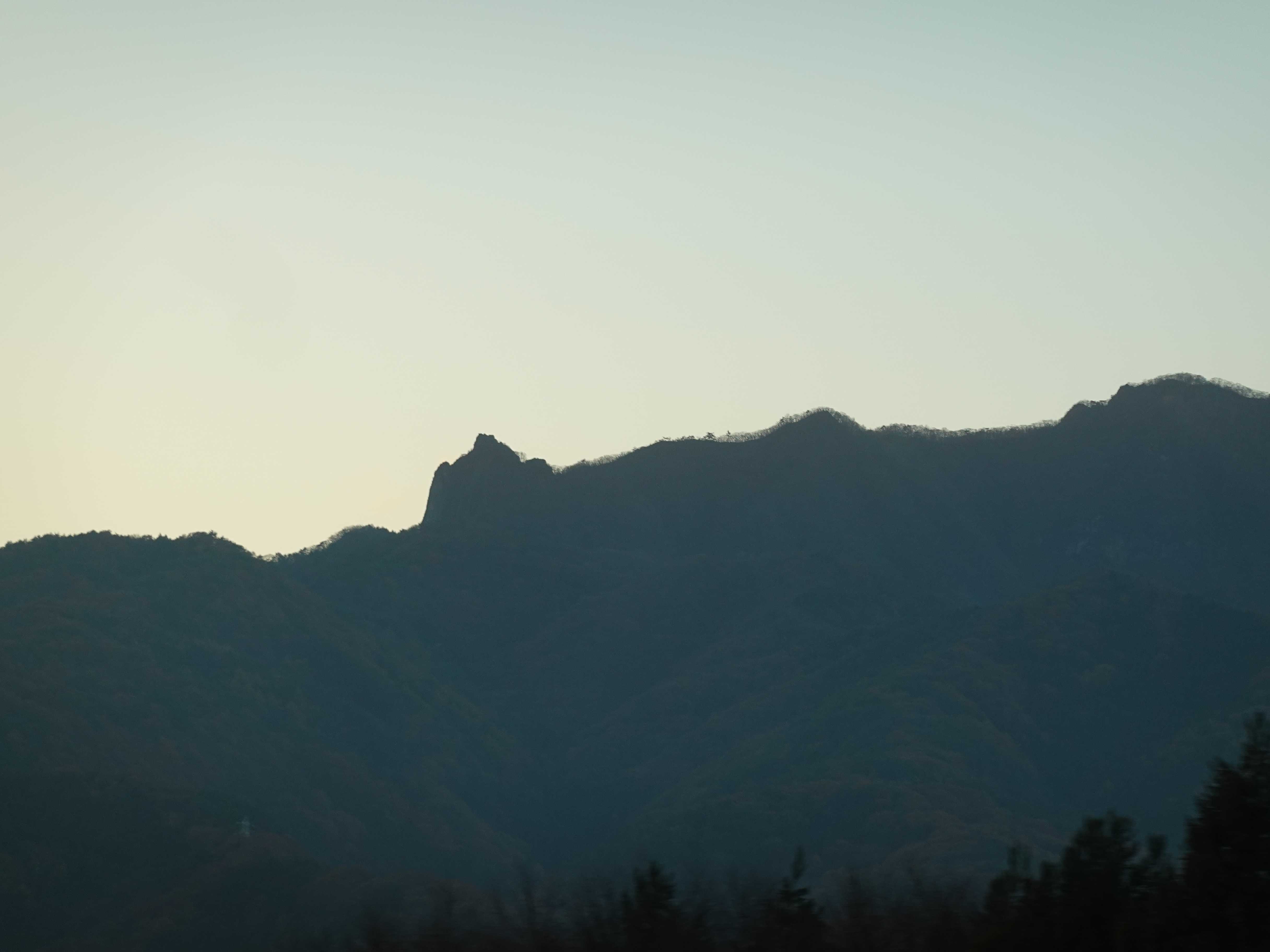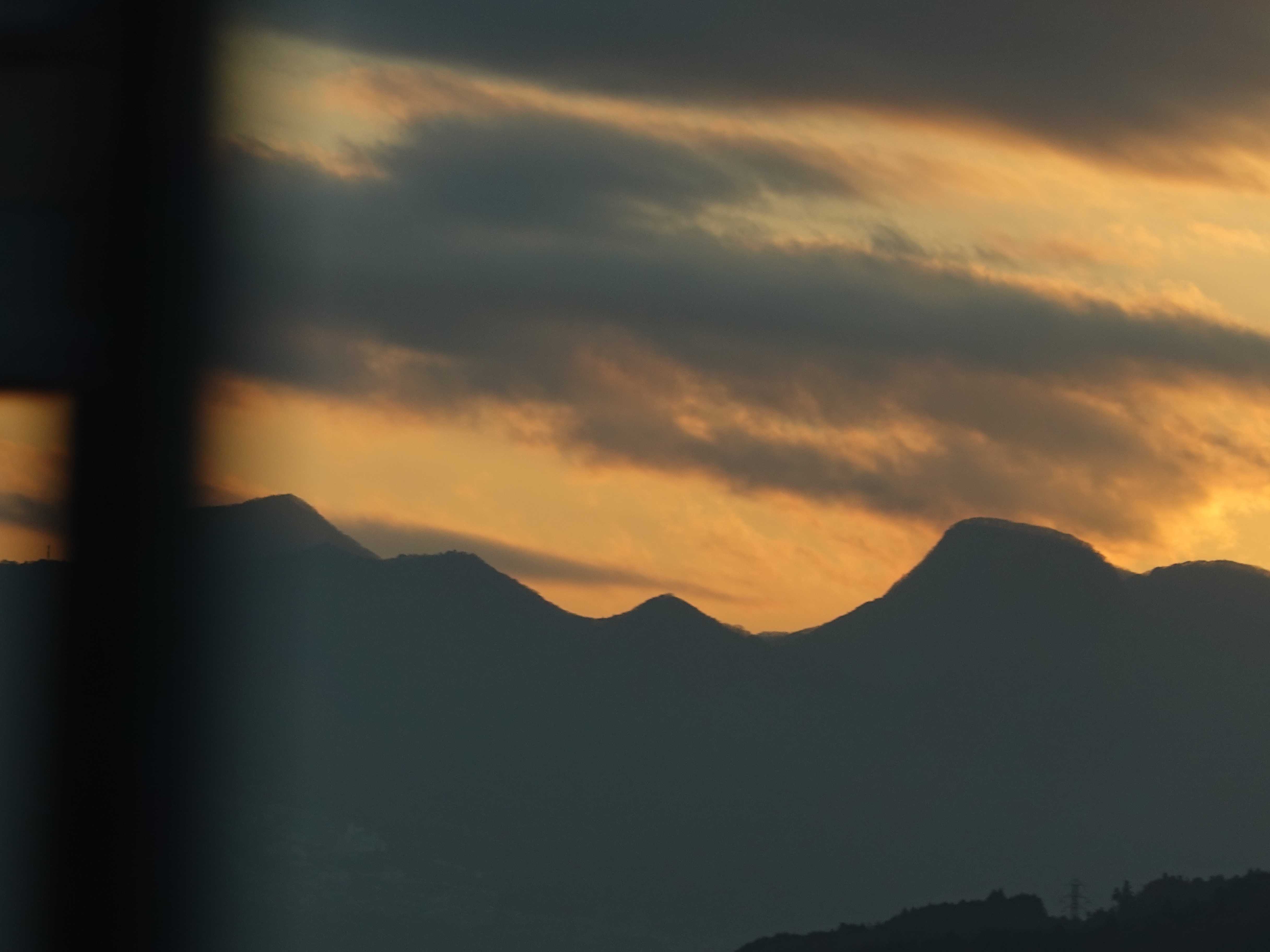 夕焼けを背景に山々が黒くなり山の端がはっきりと。