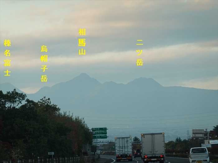 左手奥、左の「小野子山」、右の「子持山」の鞍部の奥に見える白い山は「谷川連峰」。