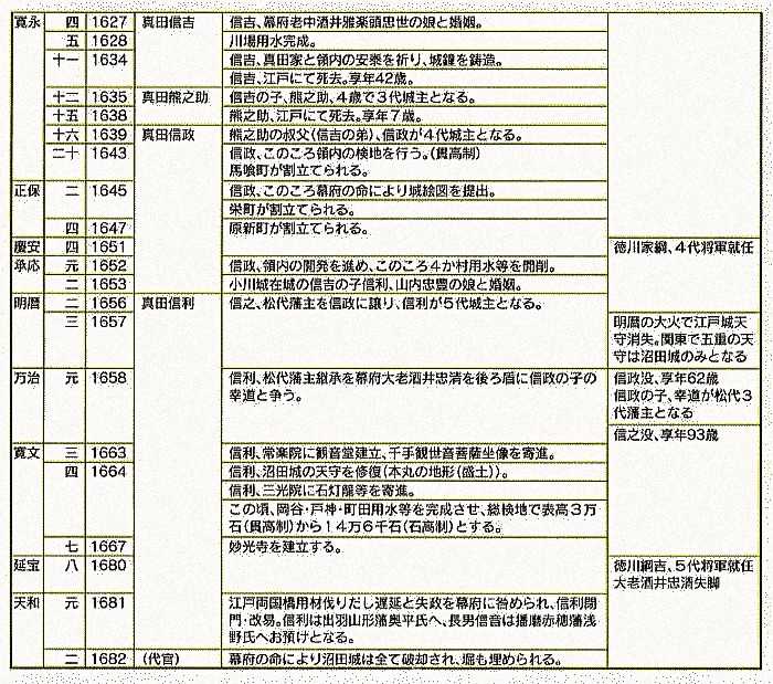 城下町造りなど城下町沼田の基盤を行うが元和2年(1616年)沼田を長男・信吉に与えて上田に移る。