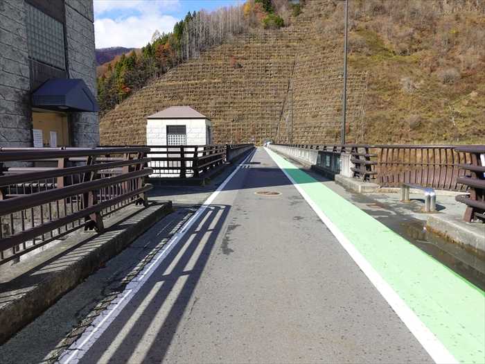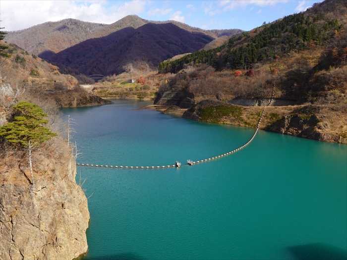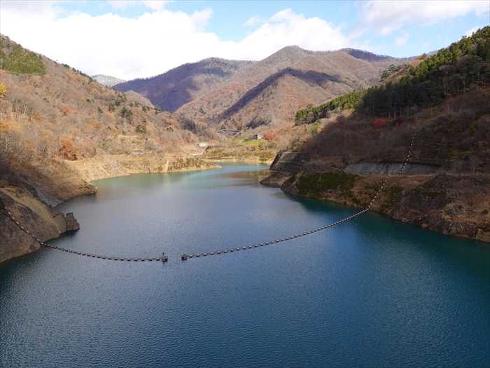 「奥四万湖」とその奥に「赤沢橋」を見る。