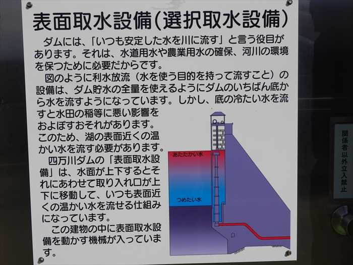 四万川ダムの「表面取水設備」は、水面が上下するとそれにあわせて取り入れ口が上下に移動して、