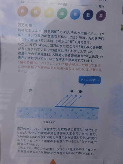 四万の水について、現在まで、分散粒子の特定はできていませんが、五色沼の青色の湖と環境が