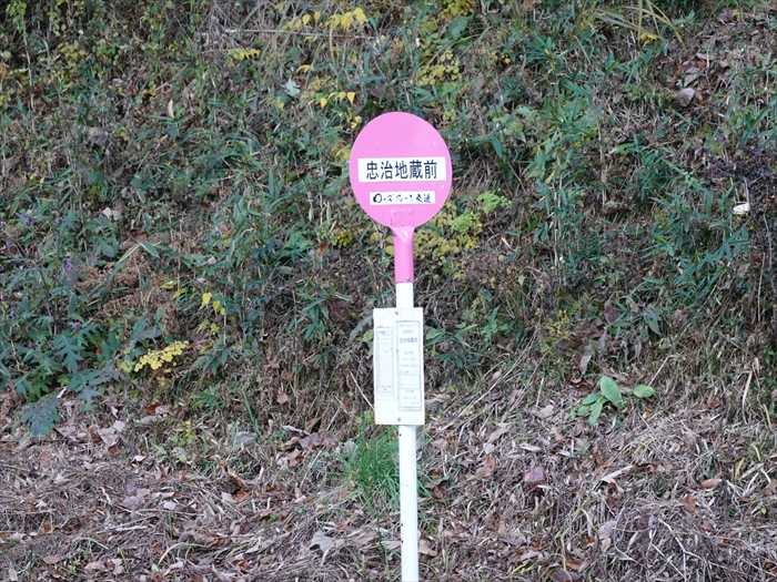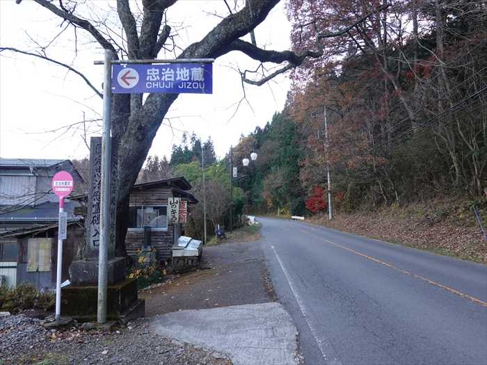 車に戻り2分ほど南に進むと、左手にあったのが バス停「忠治地蔵前」