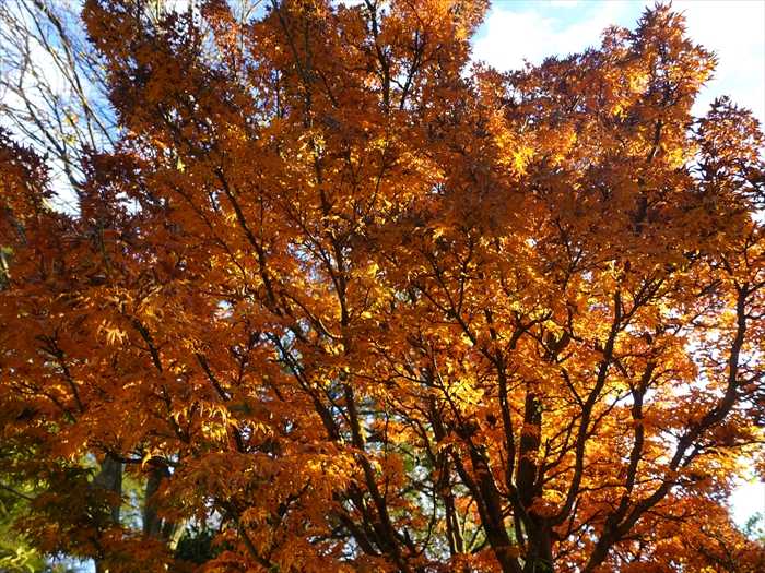 オレンジ色等があり、常緑樹などの緑色も混ざって多彩で、葉の色彩が陽光を浴びて更に鮮やかに