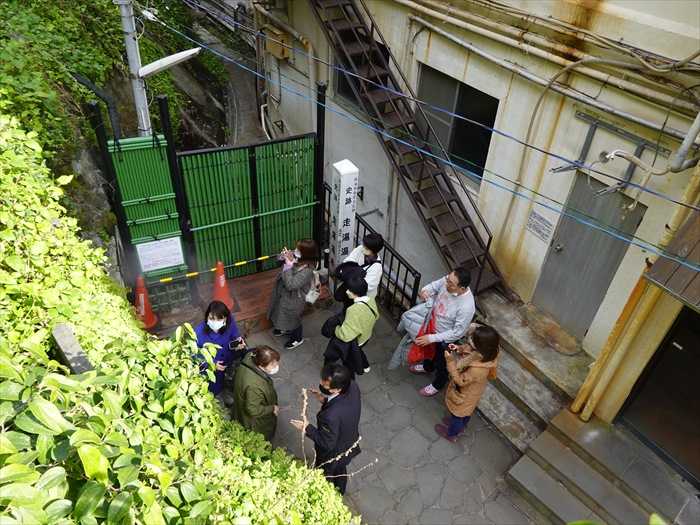 「走り湯」入口を見下ろす。多くの方々が順番を待っていた。