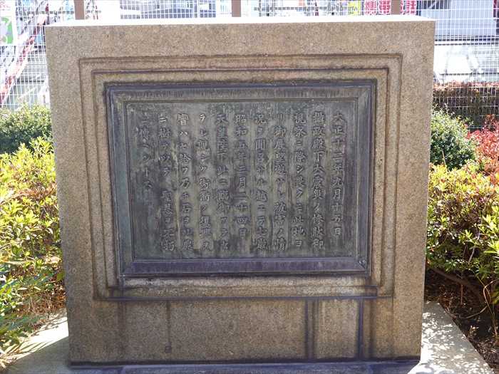 親シク街衢ノ復興ヲ曫ハセ給フ。乃テ石ヲ此處ニ樹テ以テ 聖恩ヲ不朽ニ傳ヘントス。」