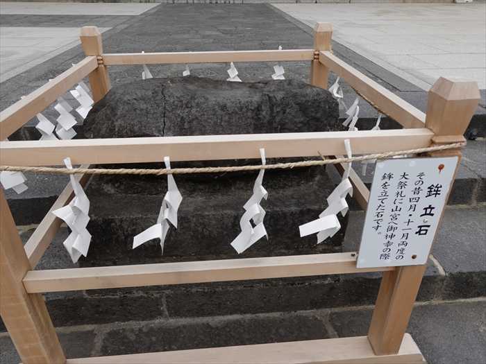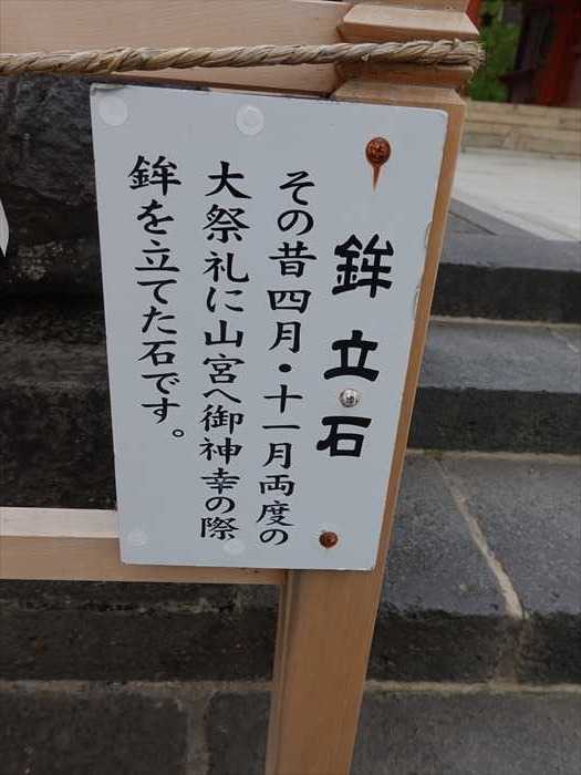 その昔四月・十一月両度の大祭礼に山宮へ御神幸の際、鉾(ほこ)を立てた石です。」