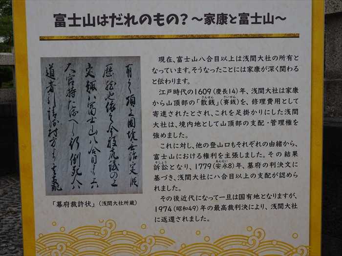 訴訟となり1779 (安永8)年、幕府の判決文に基づき、浅間大社にハ合目以上の支配が認められ