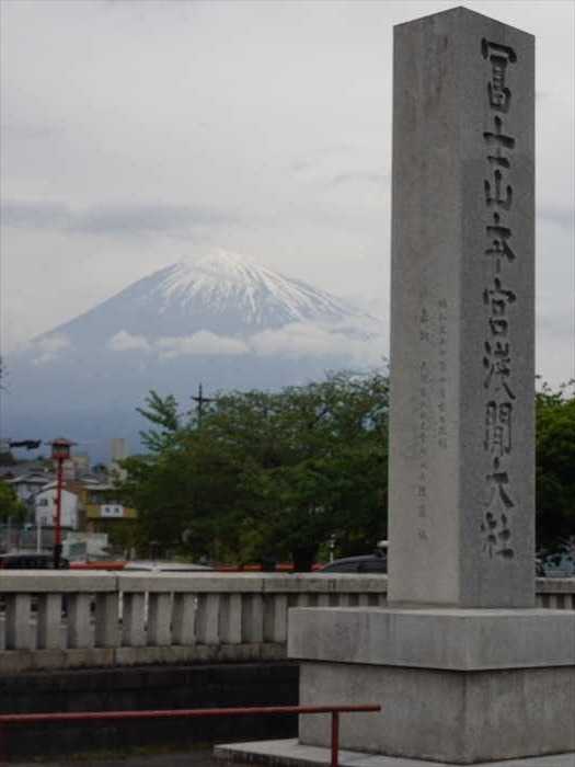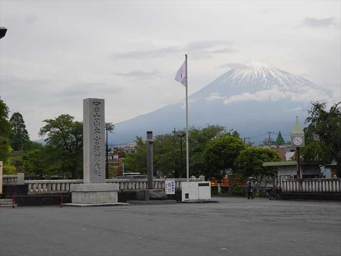 富士山と社号標石「 冨士山本宮浅間大社 」。