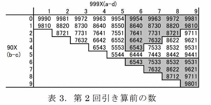 次に、第 2 回引き算を実行するために、表2の数を大きい順に並べ変えると表 3 になる.