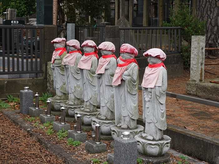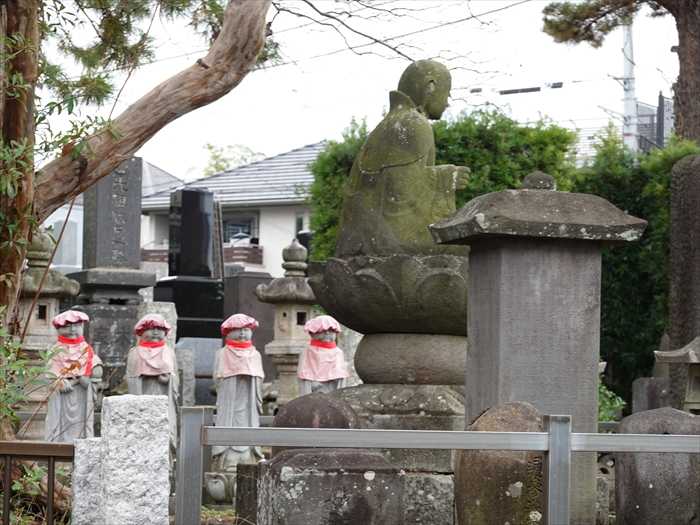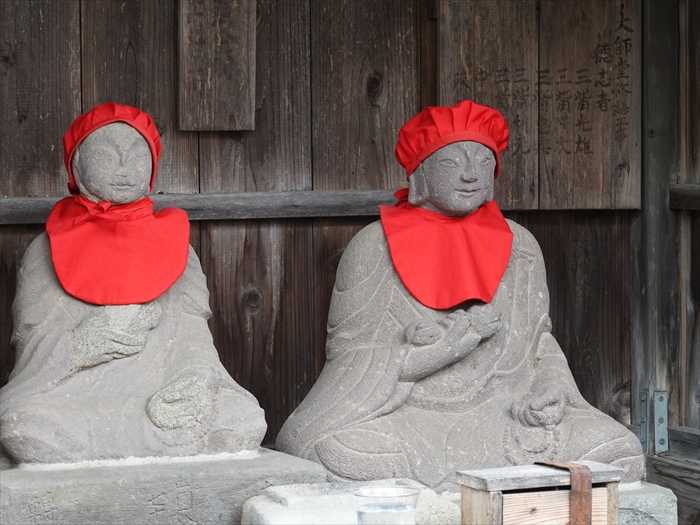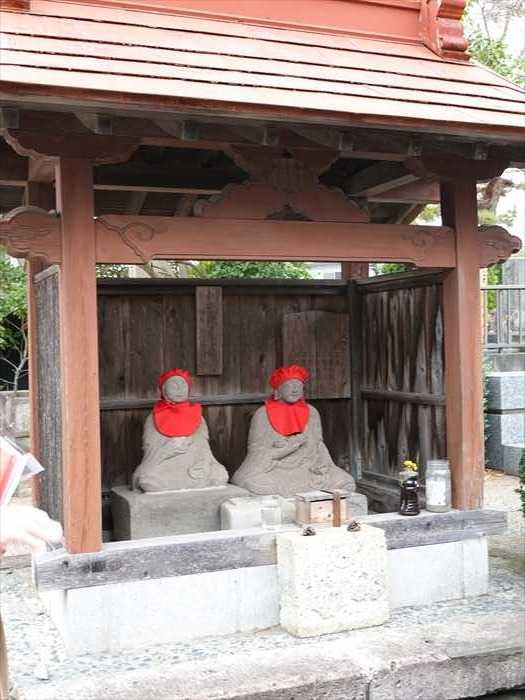 墓地の東端の道路沿いに赤い屋根の小堂が立っていて、中に 2体の大師像 があった。