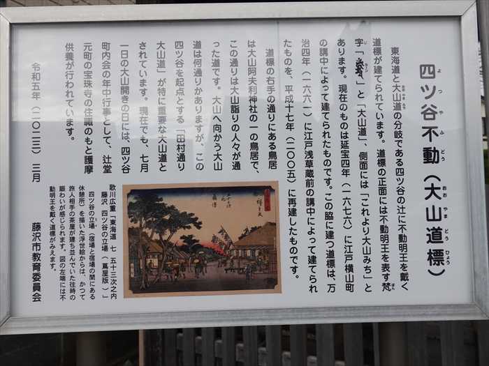 東海道と大山道の分岐である四ッ谷の辻に不動明王を載く道標が建てられています。