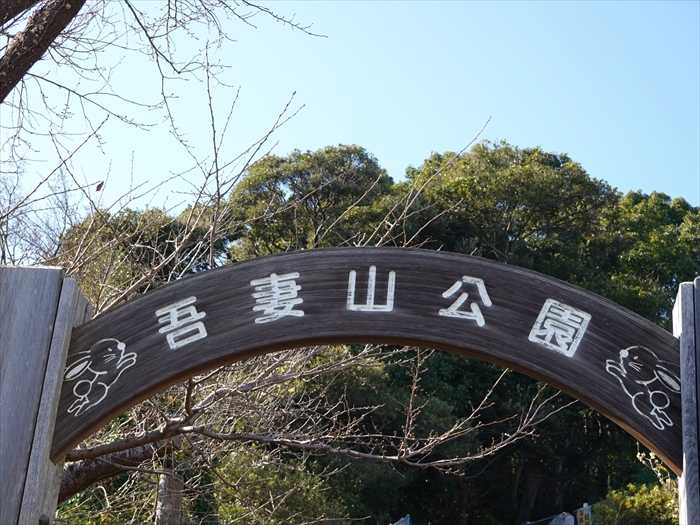 「吾妻山公園」と書かれた木製のアーチの先にはいきなり急な石段が続いていた。