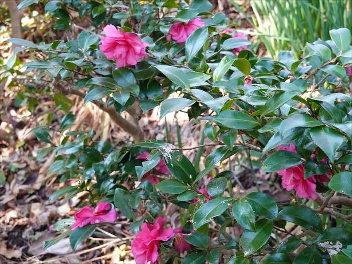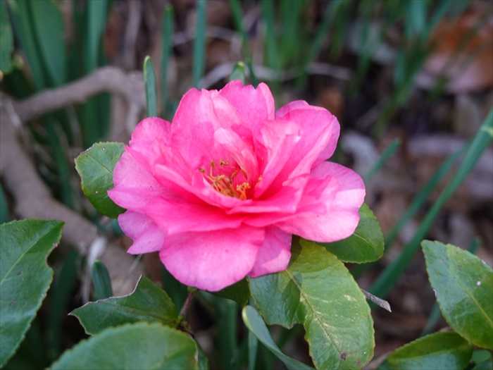 ササンカの園芸品種 花は紅色で八重咲き」と。