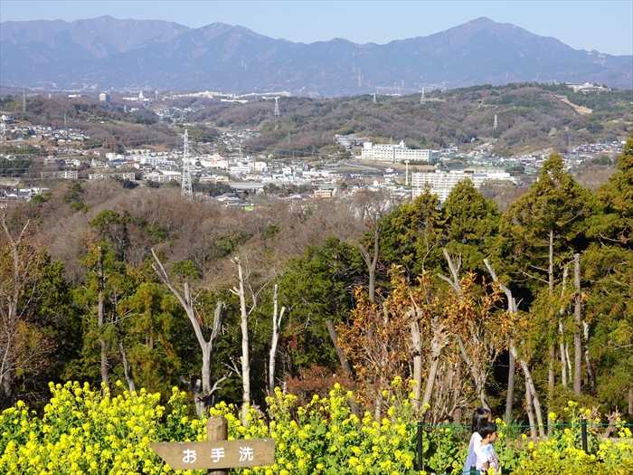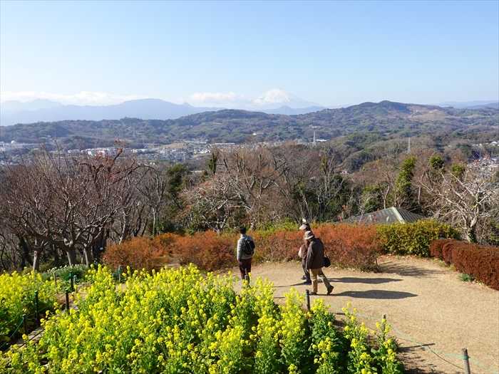 「芝生広場」の 菜の花越しに 富士山の 姿を。