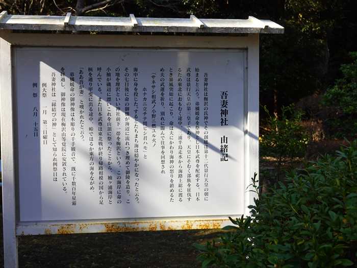 吾妻神社は梅沢の氏神でその創建は第十二代景行天皇の朝に始まると云う。弟橘媛命を祭神とし