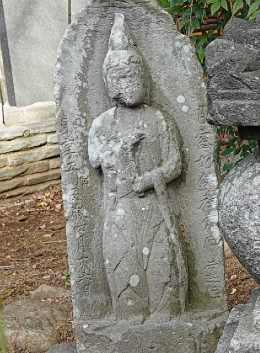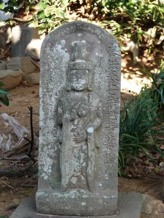 左に聖観音像を半肉彫した 月窓妙鏡禅定尼墓碑 (総高77㎝・安山岩製)