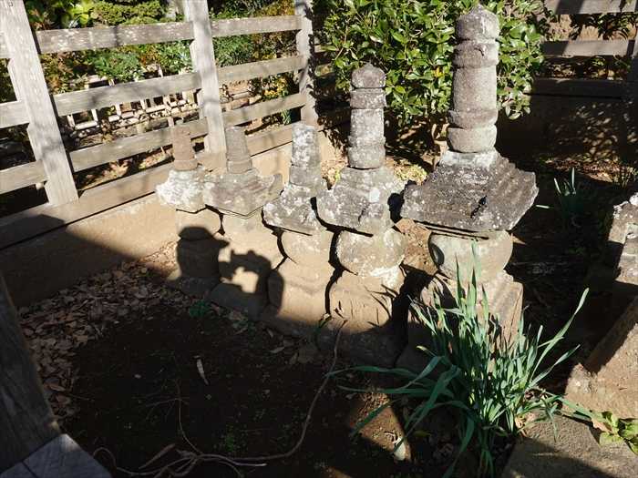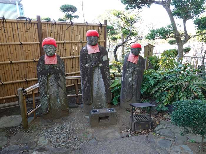 照手姫の五輪塔の墓石の前に佇む、照手姫が 建立した 3 体の厄除地蔵尊。