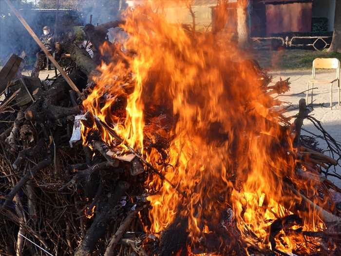 農作物の豊作を願う「どんど焼き」。正月飾りや書き初め、だるまやお守りを燃やした火で