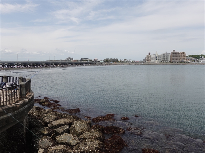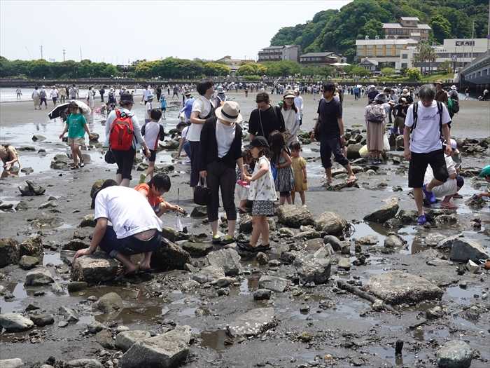 大きく潮の引いた岩場で遊ぶ家族連れの姿も増えて。