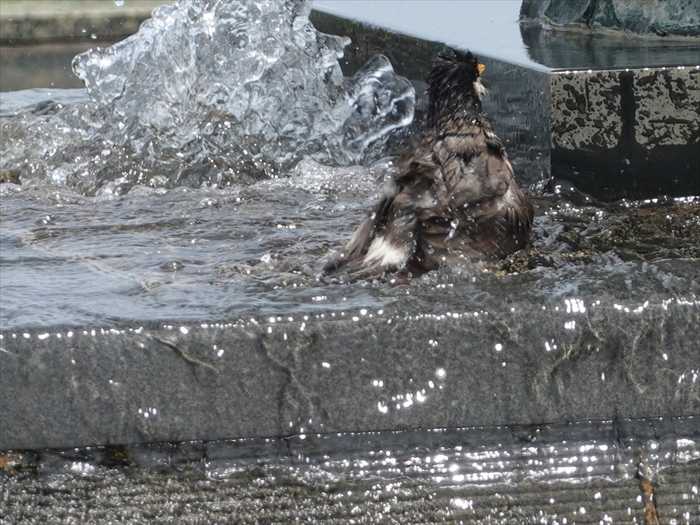 噴水は弁財天を水のベールにつつみ、昼間は太陽のひかりをあびて七色の虹をいろどり