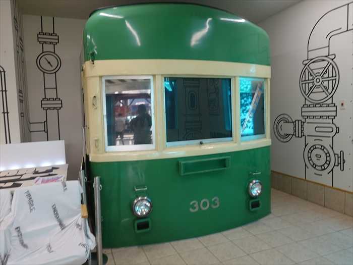 そしてホーム横の待合室内に設置されている303形電車先頭部。