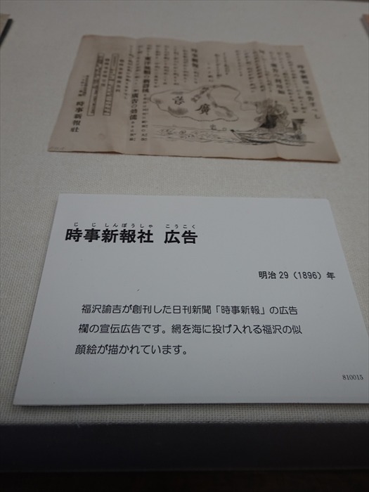 福沢諭吉が創刊した日刊新聞「時事新報」の広告欄の宣伝広告です。網を海に投け入れる福沢の