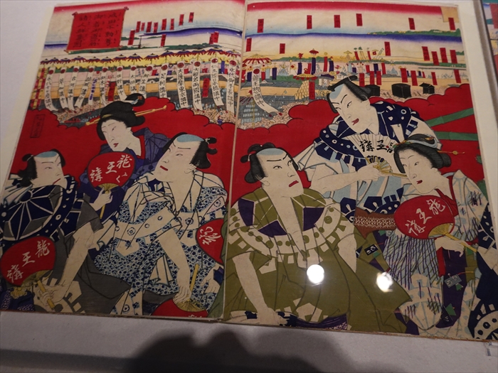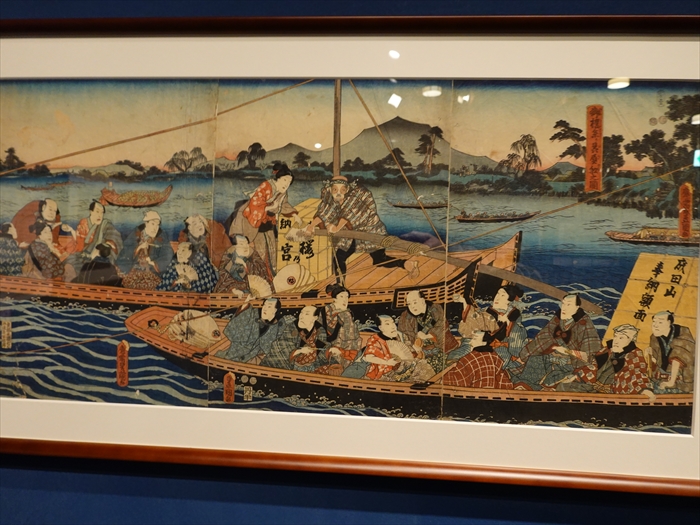 見えており、前景に描かれた2艘の船に乗るのは、大絵馬の奉納に向かう歌舞伎役者の