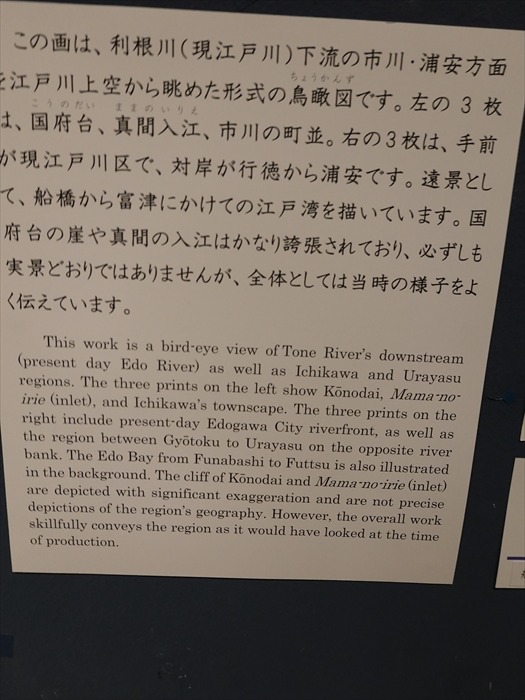 「この画は、利根川(現江戸川)下流の市川・浦安方面と江戸川上空から眺めた形式の鳥瞰図です。