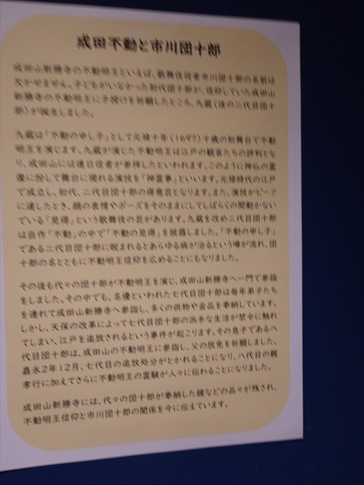 成田山新勝寺には、代々の団十郎が奉納した鏡などの品々が残され、不動明王信仰と