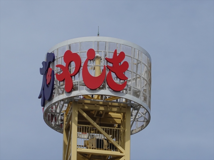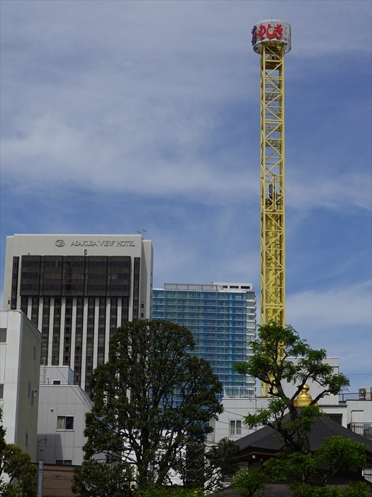 「浅草寺」の「本堂」の裏側から「 浅草花やしき 」の塔を見上げる。