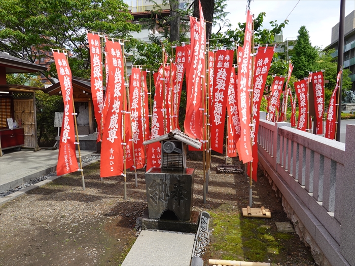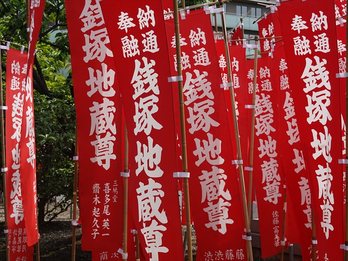 赤地に白抜きで「 銭塚地蔵尊 」と書かれた幟旗。
