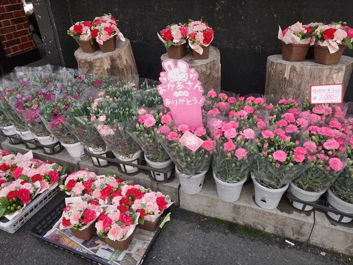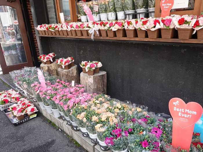 そして近くの花屋には鉢植えのカーネーションが並んでいた。
