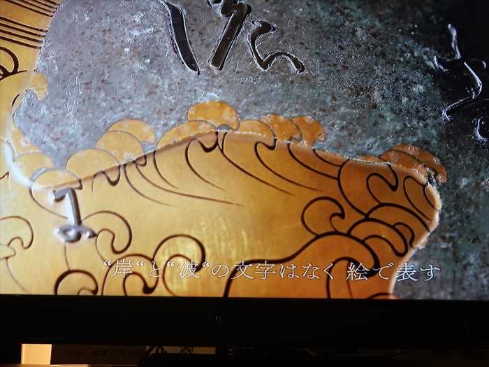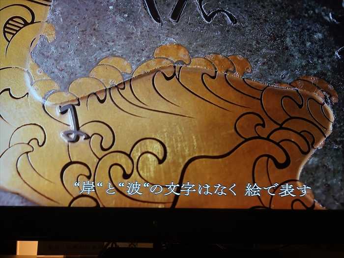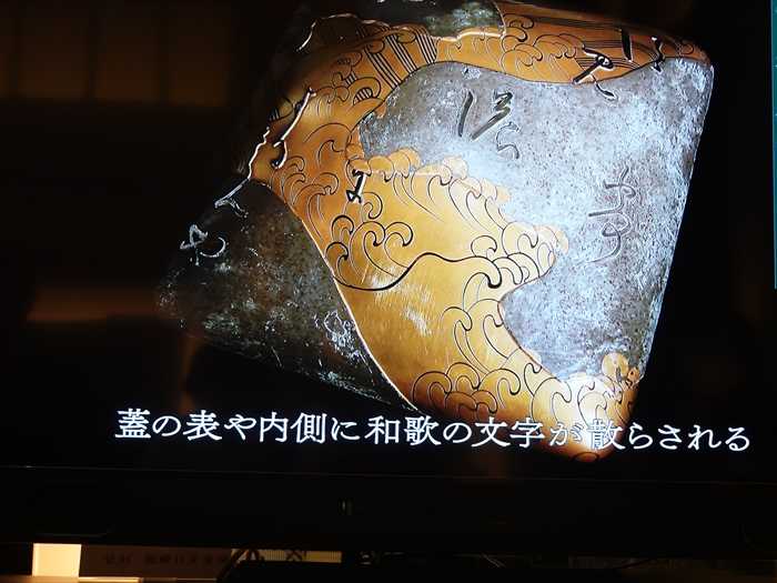 打ち寄せる波は金蒔絵、岩礁の岩を厚い鉛板で貼り、銀板を切り抜いた和歌の文字を蓋と