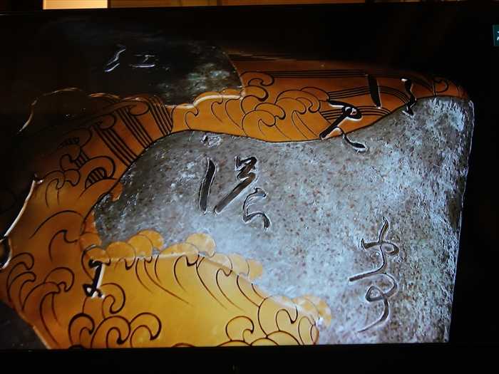 ガラス質にシワ状の構造が一定の周期で並ふ画像が公開された。調査陶片の”曜変天目に似た