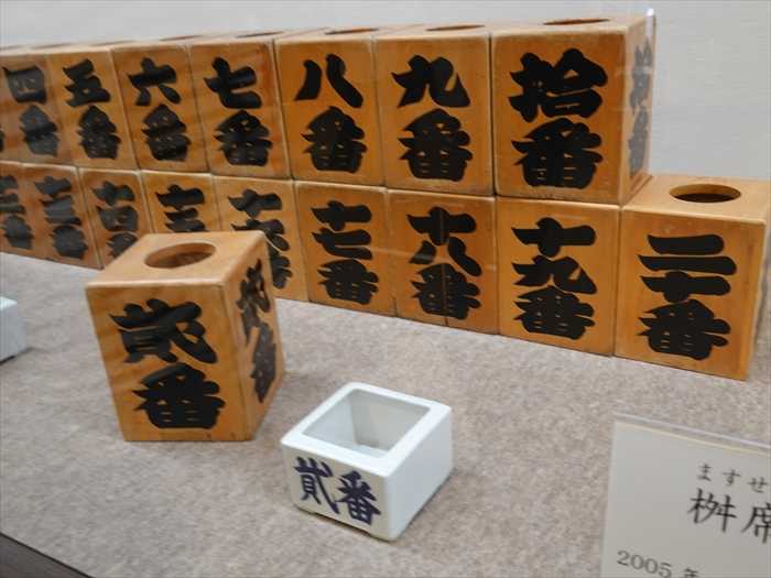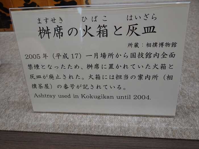 火箱と灰皿が廃止された。火箱には担当の案内所(相撲茶屋)の号が記されている。