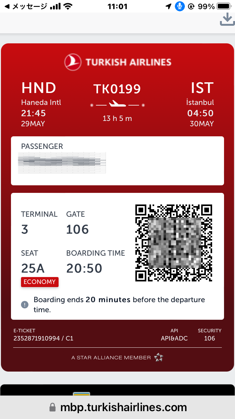 羽田~イスタンブール13時間5分のFlight。