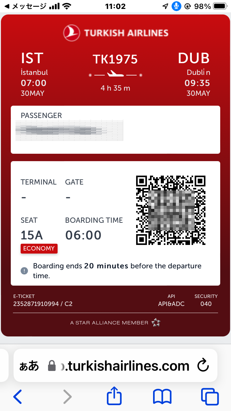 そしてトルコ・イスタンブールから目的地のアイルランド・ダブリン空港へは同じく