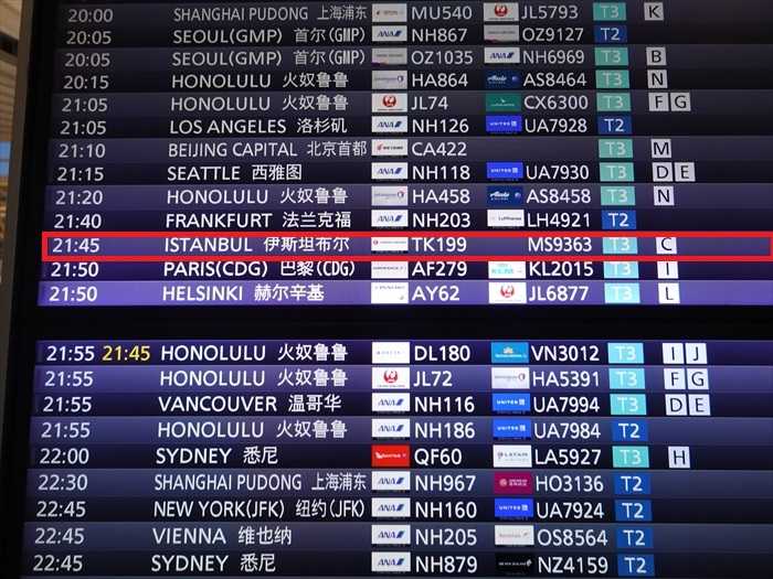 21:45発 ターキッシュ・エアラインズが運航するTK0199便