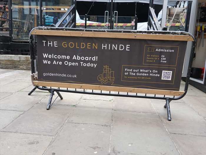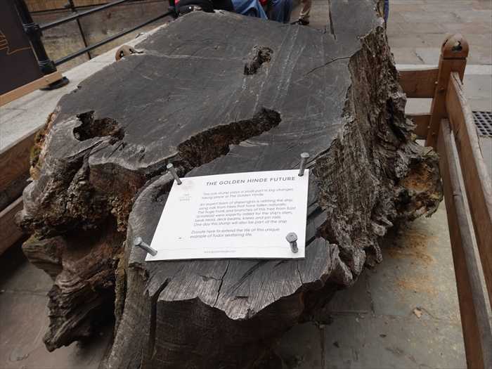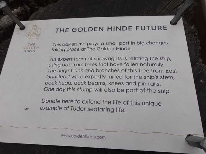 「THE GOLDEN HINDE FUTURE」案内板とオーク材の切り株。