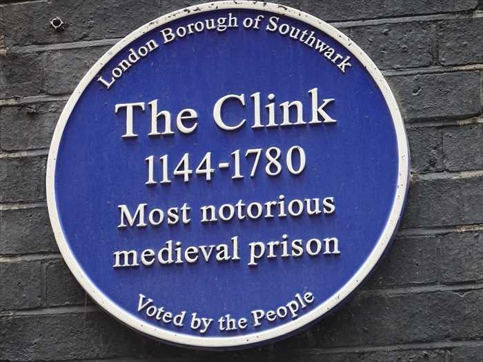 Clink Prison(クリンク監獄) を示す青い記念プレート(ブルー・プラーク風)