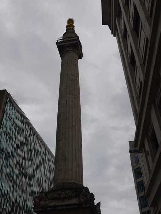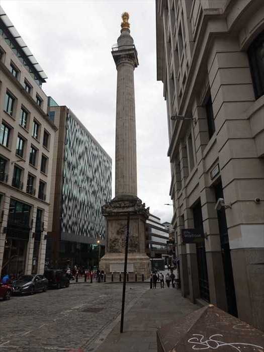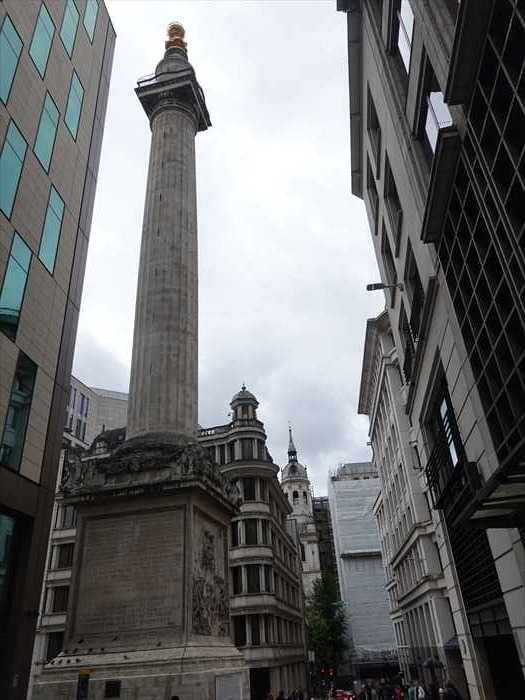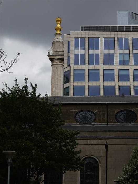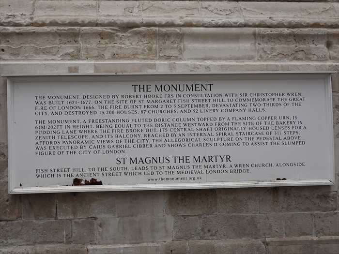 The Monument, designed by Robert Hooke FRS in consultation with Sir Christopher Wren, was built 1671–1677, on the site of St Margaret Fish Street Hill, to commemorate the Great Fire of London 1666. The fire burnt from 2 to 5 September, devastating two-thirds of the City, and destroyed 13,200 houses, 87 churches, and 52 Livery Company Halls.